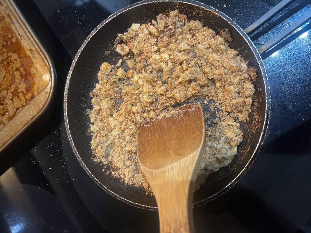 - Add breadcrumbs and walnuts, toasting until golden (3–4 minutes).